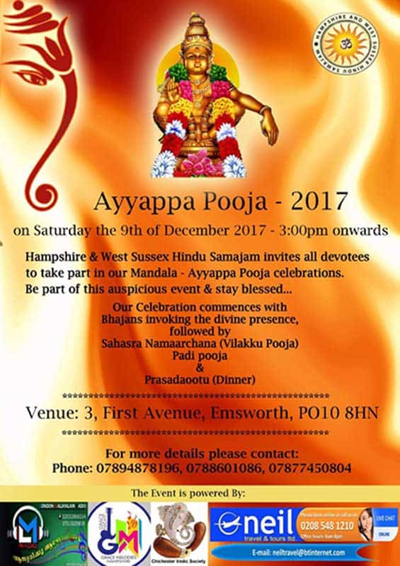 Hampshire and West Sussex Hindu Samajam conducted their yearly Ayyappa Pooja on 6th December 2016. It was a very spiritual event attended by over 100 members of the Community. It was supported by Chichester Vedic Cultural Society. Leaflets about the event were given to the members for the first time.