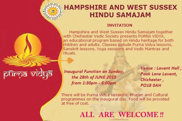 Purna Vidya program was supported by Chichester Vedic Cultural Society. This was organised by Hampshire & West Sussex Hindu Samajam who have been training children with basic foundation knowledge of Hindu Vedas (ancient literature). Program was conducted at Lavant Memorial Hall, East Lavant. The program also reflected how Indian Dance culture has helped children and budding young adults to keep in touch with their traditional Indian classical dances while they grow up in UK.